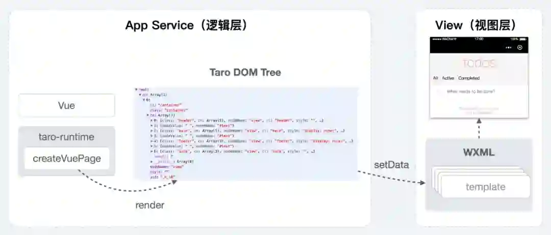 在 Taro 中使用 Vue 也是一样的,通过调用 createVuePage 创建 DOM Tree 之后就可以实现打通整个流程。