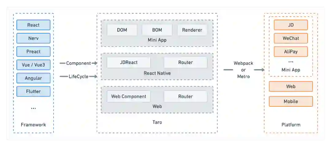 在 Taro 3.x 对整体框架调整之后,大大降低了适配新框架的成本,通过对齐组件和生命周期我们就可以在 Taro 的生态中引入一个新的框架。