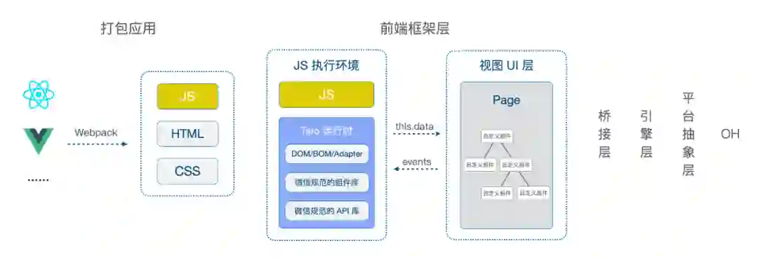 最终就可以看到我们写的代码可通过 webpack 打包成应用,在前端框架层通过 Taro 提供的运行时与 UI 视图交互数据和事件,加上 OH 提供的基础能力就可以为鸿蒙端适配渲染。