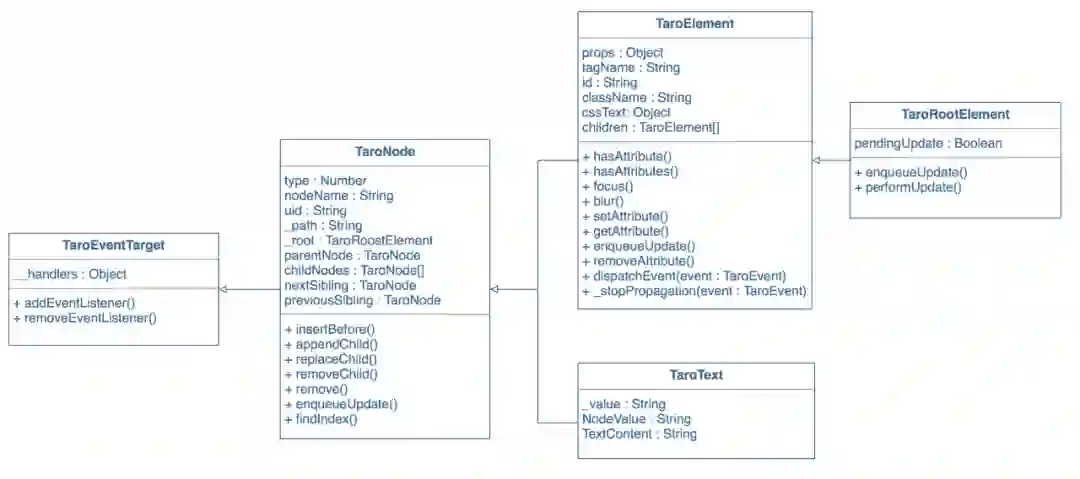 对于 Taro 来说端有很多,小程序端、React Native 端、Web 端、快应用端,其中很多都是社区帮助完成适配的。在这里我们以小程序端为例,Taro DOM Tree 在渲染的过程中根据不同的小程序平台其实是会有所不同的,但都是基于 template 组件提供的渲染方法。