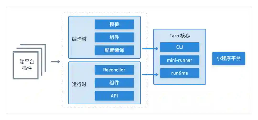 插件化架构帮助我们引入了一个新概念——端平台插件,它帮助我们将每一个端的能力拆分开,插件通过提供编译时的模板、组件、编译配置,加上运行时所需的组件、API 和渲染器,将它们分别注入 Taro CLI 和 Runtime 中对应的生命周期,Taro 就能够转译成对应端的代码。