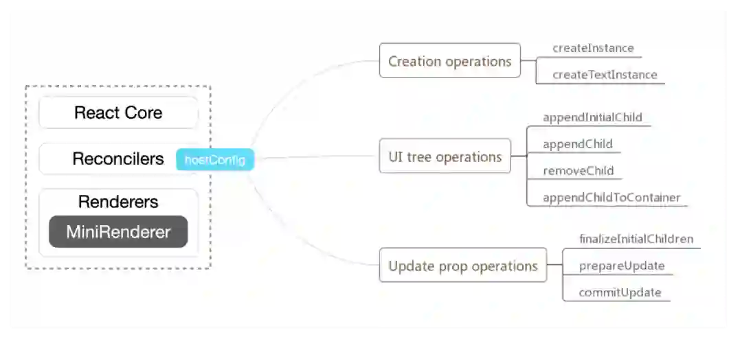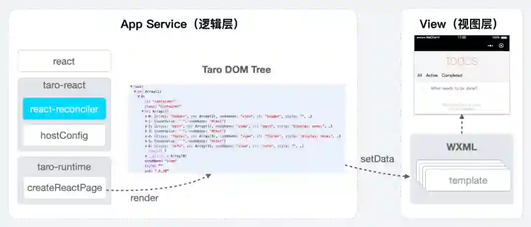 当生命周期对齐,页面只要渲染出来就可以了,当然这里每个框架会有些不同。以 React 为例,ReactDOM 作为渲染器,功能非常丰富,但包体很大而且并非所有都在小程序中需要用到,选择使用 react-reconciler 自定义渲染器精简是个很容易做出的决断,加上 hostConfig 注入对应的依赖, taro-react 就完成了。