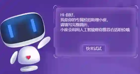 第一,智能岗位推荐。打开百度招聘主页(talent.baidu.com),点击校园招聘之后,会出现个人专属的智能招聘助手小度,一旦将简历上传至页面,小度会自动为大家进行岗位推荐。