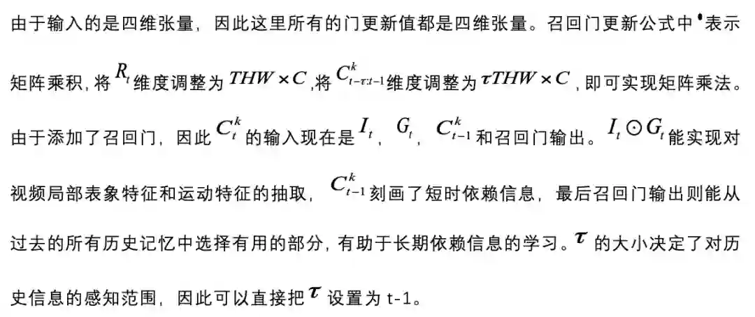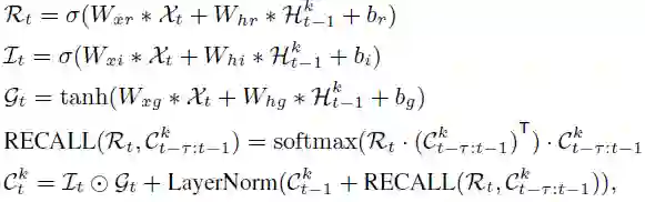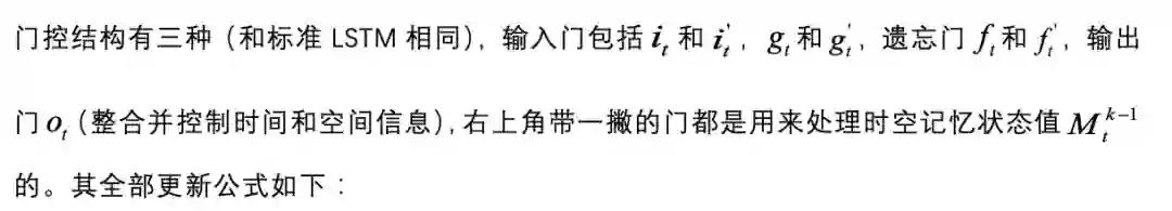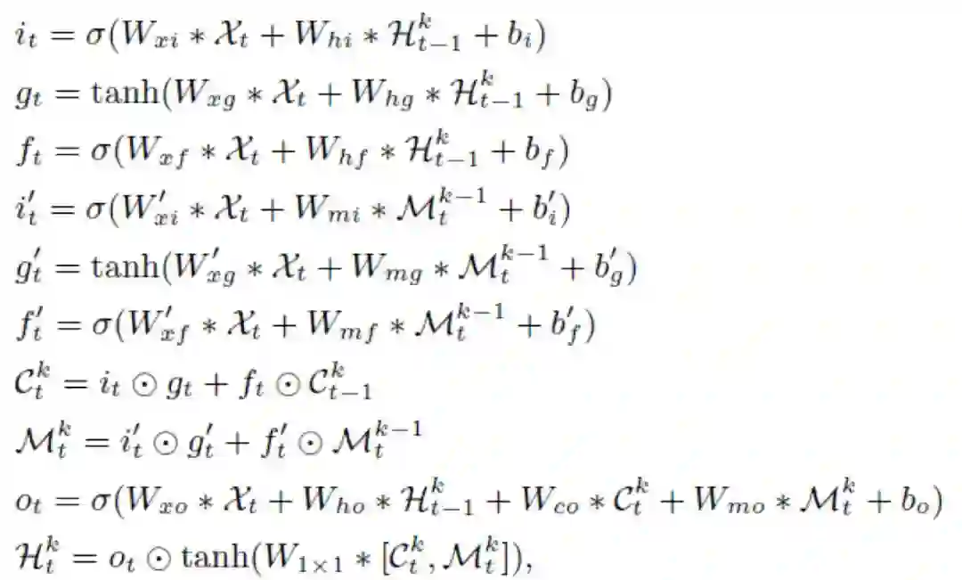大部分门结构的更新公式和 ST-LSTM 相同,额外添加了召回门更新公式: