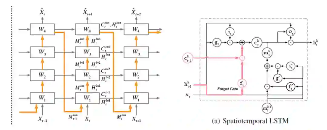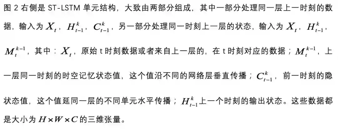 和标准 LSTM 相比,ST-LSTM 还增加了不同层间对应位置的 cell 连接,如图 2 左侧,水平灰色连接线表示标准 LSTM 的单元连接,竖直黄色连接线表示层间同一时刻的单元连接,通过张量 M 传播,注意当 l=1 时,