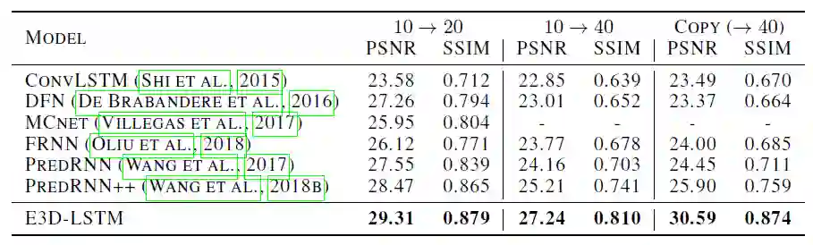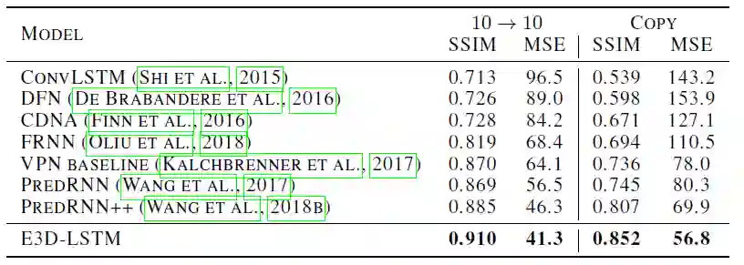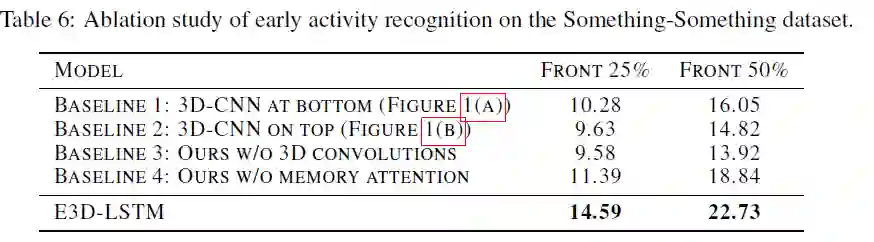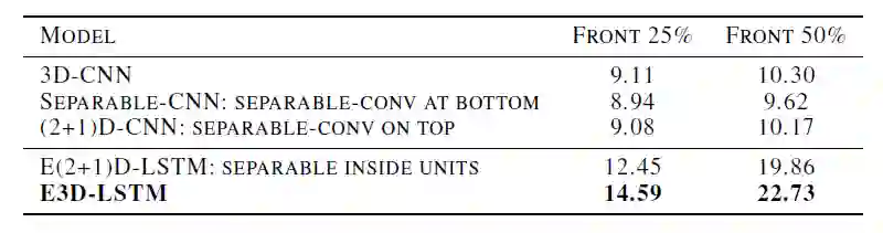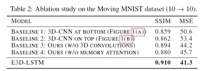 为了验证 E3D-LSTM 中不同模块对性能的影响,作者还在该数据集上进行了烧蚀研究: