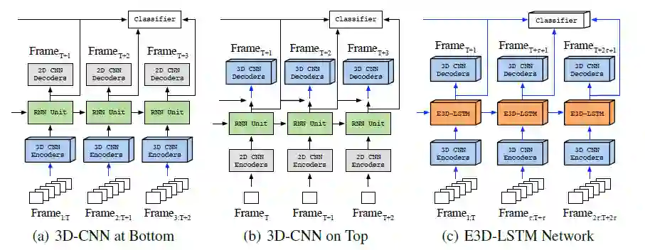 图(c)是 E3D-LSTM 网络的结构,3D 卷积作为编码 - 解码器(蓝色模块),同时和 LSTM 结合(橙色模块)。E3D-LSTM 既可用于分类任务,也可用于预测任务。分类时将所有 LSTM 单元的输出结合,预测时则利用 3D 卷积解码器的输出作为预测值。