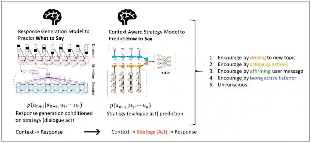 然而,用户在与小冰对话时也常会感受到压力。比如两者间的对话总是需要人类来提出话题,小冰来回应。就好像我们与感兴趣的异性搭讪,如果总是自己主动、对方被动,对话就会变得淡乎寡味、如同鸡肋——共感模型的开发就是针对这一状况。共感模型可以帮助小冰自行判断对用户的话题是否有感,在此基础上,小冰将会主动求证,进而引导话题的方向,增添新的聊天内容。这样就减轻了用户的压力,同时增加了聊天的自然度和趣味性。从学术的角度,武威博士提出的共感模型(如图1所示)把“说什么”的问题在逻辑上拆成了两步:由上下文决定“怎么说”的策略;根据策略和上下文来决定具体“说什么”。