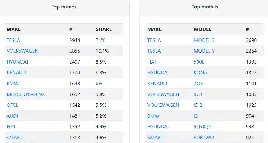 大众汽车集团的ID.4和ID.3排在第六和第七位,销量都是刚过1000辆。
