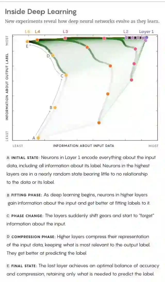 在深度神经网络通过随机梯度下降调整其连接权重的过程中,首先,网络存储的关于输入的数据会大致保持恒定或者稍微增加一点点,这时网络连接会进行调整,为输入中的模式进行编码,更好地拟合标签。有一些专家也将这个阶段与记忆进行了类比。
