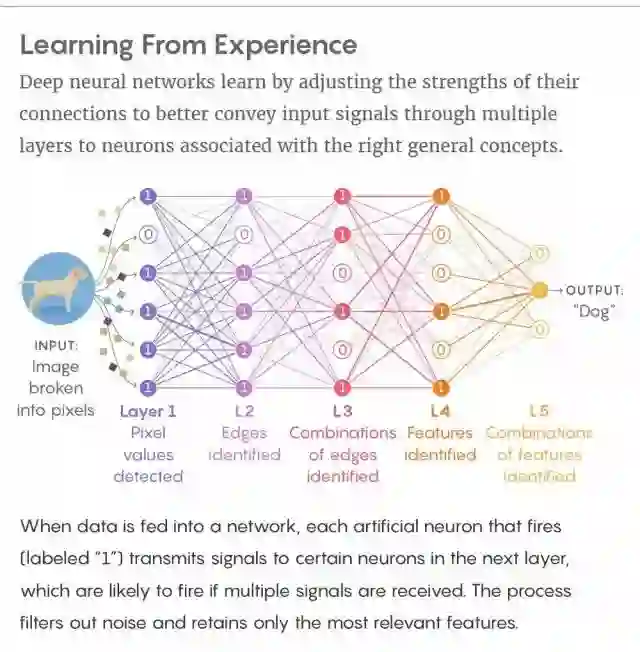 像大脑一样,深度神经网络也有很多层神经元。当神经元被激活时,它会发出信号,连接上面一层的神经元。在深度学习的过程中,网络中的连接会根据需要被加强或减弱,从而让网络更好地根据输入(例如一张狗的照片的像素)发送信号,信号层层向上,经过所有相关的神经元,这些神经元都与“狗”这个概念的高层抽象有关。一个深度神经网络在“学习”过数以千计的狗的照片后,能像人一样准确地识别出从未见过的照片中的狗。