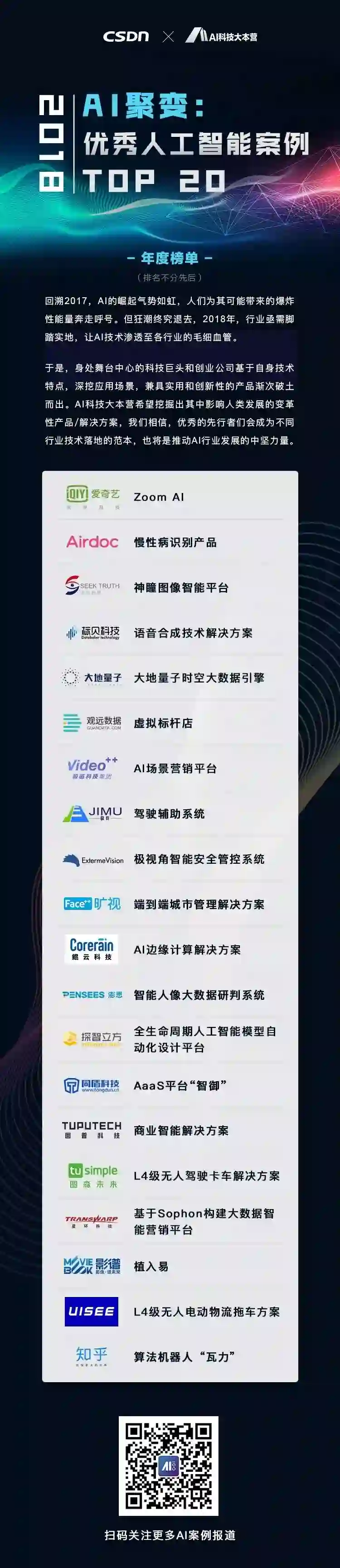 AI科技大本营从技术性、产品/解决方案创新性、行业发展前瞻性和竞争力、市场发展潜力等综合维度评估了这些申请案例,并最终评选出 2018 年优秀 AI 应用案例 TOP 20。我们相信,这些优秀案例的挖掘不仅会彰显 AI 技术价值,同时也会为不同 AI 行业领域的发展带来启迪。