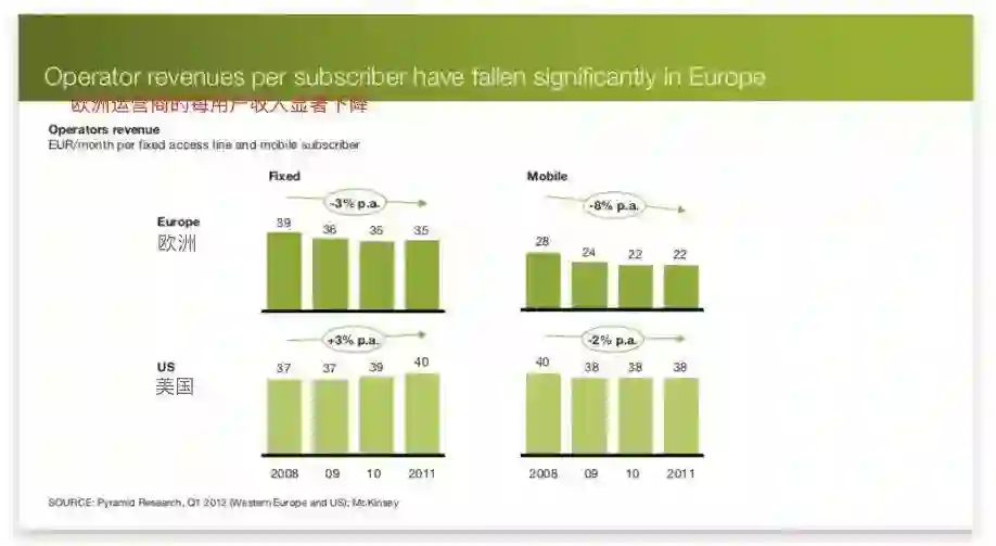 根据麦肯锡的报告指出,从2008年到2011年,欧洲运营商的人均固定网络服务收入以平均3%的年速率在降低,人均移动网络服务收入的平均年降速则为8%。到2011年,欧洲的这两个收入值都比美国要低得多。