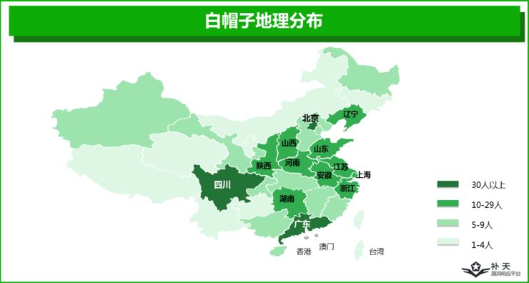 目前,中国白帽子的人口分布集中在华东地区(约占25%)、华南地区(约占20%)、华北地区(约占20%)、华中地区(约占10%)、和西南地区(约占10%),再向下追溯更加聚焦于广东,北京,四川,山东,上海,江苏等经济科技相对发达地区及一线城市。