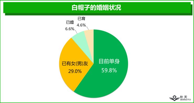 或许是因为挖洞的成就感远远超过了异性的吸引力,白帽子群体堪称单身狗俱乐部。接近60%的白帽子目前还是单身状态;虽然也有近三成的白帽子已经有了自己的女(男)朋友,但真正已婚、已育的白帽子仅有10%多一点。