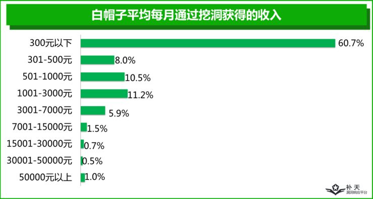 通过挖洞,白帽子到底能够获得多少收入呢?调查显示,超过60.7%的白帽子通过提交漏洞每月获得的奖励在300元以下, 20%的白帽子可通过提交漏洞获得1000元以上的奖励。其中,仅仅有不到10%的白帽子可以每月获得3000元以上的奖励,而这些白帽子大多参与了“众测”项目。很多白帽子反映漏洞越来越难挖,这与国内网络安全建设愈发受到重视有很大的关系,“高价值”的漏洞对技术的要求越来越高,这也是对白帽子群体的技术水平发起的挑战。
