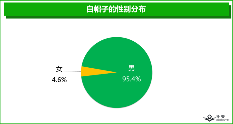 调研显示,中国95.4%的白帽子是男性,男女性别比例高达21:1,女生在白帽子中属于绝对的稀有品种。