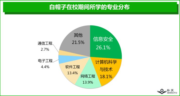 “年轻宅男”是白帽子群体的第一个显著特征。调研显示,“男同学”是组成白帽子群体的主要人群,超过半数的白帽子是95后。同时,白帽子人群的学历结构正在逐步提高,八成以上的白帽子拥有大专或本科以上学历,甚至硕士、博士群体的加入也已经不再罕见。