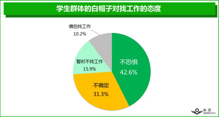 从学生群体的白帽子对找工作的态度来看,有10.2%的白帽子是惧怕找工作的,31.3%的白帽子没有明确的态度;15.9%的白帽子暂时不找工作;有42.6%的白帽子不恐惧找工作。