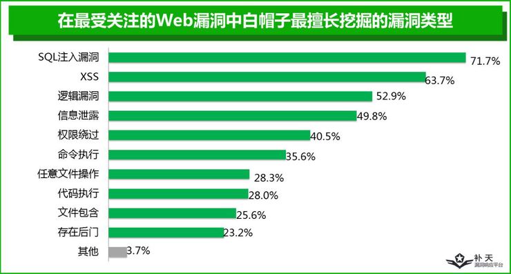 在各类Web安全漏洞中,白帽子们最擅长挖掘的是SQL注入漏洞,擅长比例高达71.7%;其次为XSS漏洞,擅长比例为63.7%;逻辑漏洞排第三,擅长比例为52.9%。