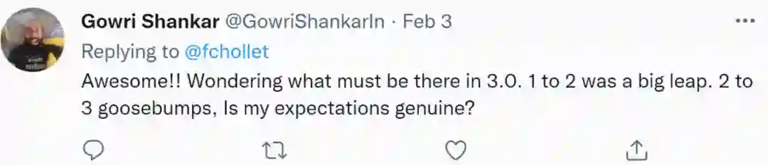 不过也有网友已经迫不及待的期待 TensorFlow 3.0 的到来,并表示 TensorFlow 1 到 TensorFlow 2 是一个巨大的飞跃,将来 2 到 3 又会有哪些亮眼的表现呢?