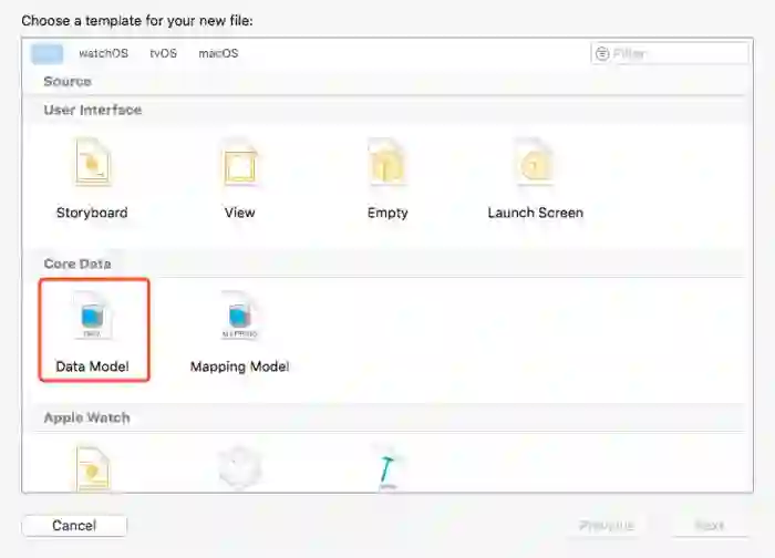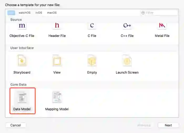 创建项目的时候,勾选下图中的Use Core Data选项,工程中会自动创建一个数据模型文件。当然,你也可以在开发中自己手动创建。
