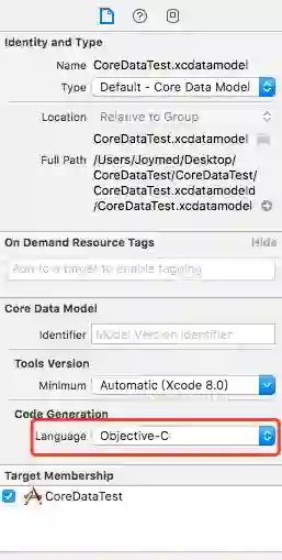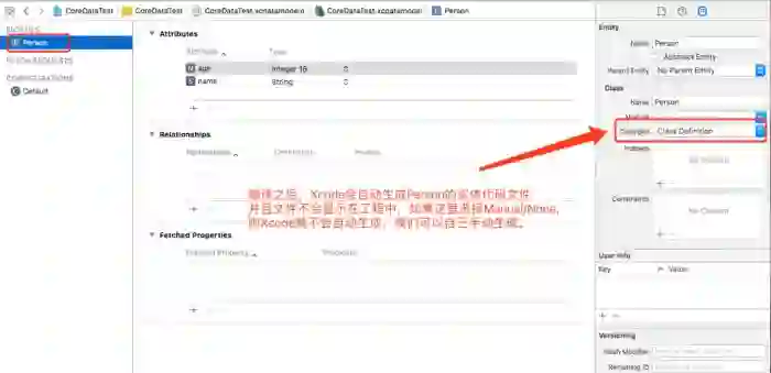 编译之后,Xcode会自动生成Person的实体代码文件,并且文件不会显示在工程中,如果下图中右侧Codegen选择Manual/None,则Xcode就不会自动生成代码,我们可以自己手动生成。