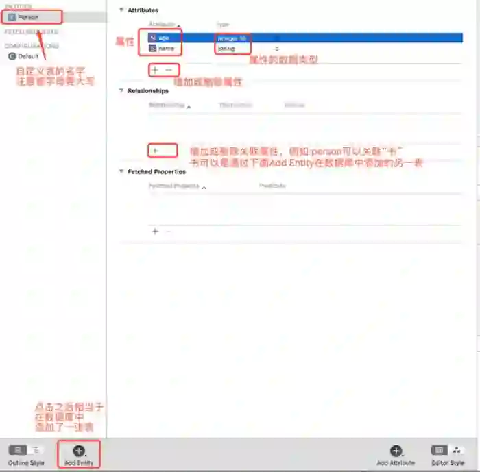 点击Add Entity之后,相当一张数据表。表的名称自己在上方定义,注意首字母要大写。
