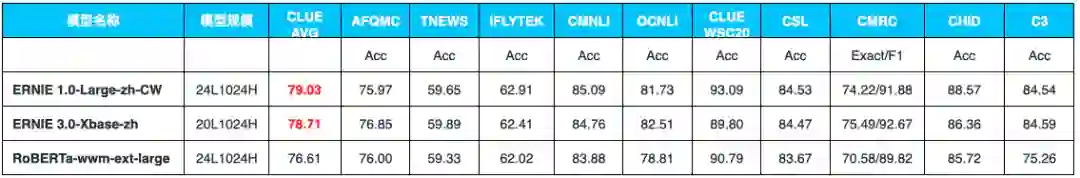 表2:ERNIE 1.0-Large-zh-CW和ERNIE 3.0-Xbase-zh效果领先