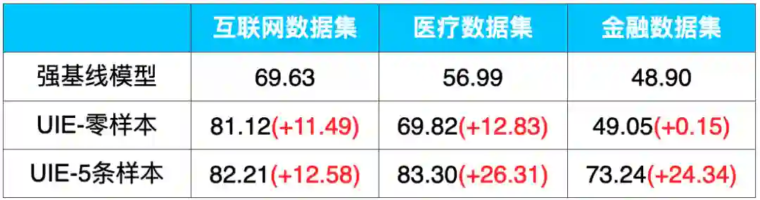 表1:UIE在信息抽取数据集上零样本和小样本效果(F1-score)