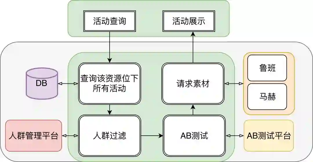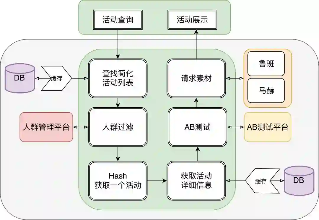 具体的检索逻辑如上图所示,首先在DB中查询当前资源位下的所有在线活动,然后依次过滤每个活动下的人群信息是否符合当前用户,从符合该用户的活动列表中选取一个活动,如果该活动下有AB测试,需要请求AB测试平台获取AB测试中配置的素材信息,最后返回该活动下的素材内容,客户端拿到活动素材后进行展示。