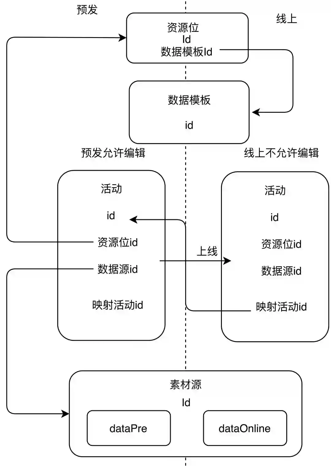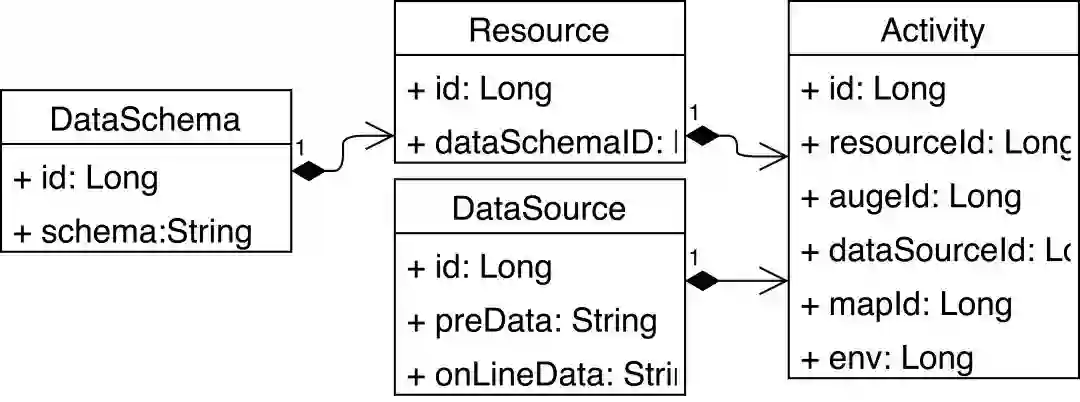 Activity实体是DataSource和Resource的关系实体,同时包括活动的人群、起止时间等属性。由于DataSource和Resource实体线上和线下环境中主键ID都不会改变,那么意味着Activity可以把线下的配置直接同步到线上,在同步过程中需要做的是如果线上没有配置就插入一条如果存在就更新。那么怎么映射Activity线下和线上的关系呢,在Activity里面引入了mapId字段,线下的Activity实体在mapId中存储线上Activity实体的主键Id,利用这种映射关系实现了线下和线上的映射。