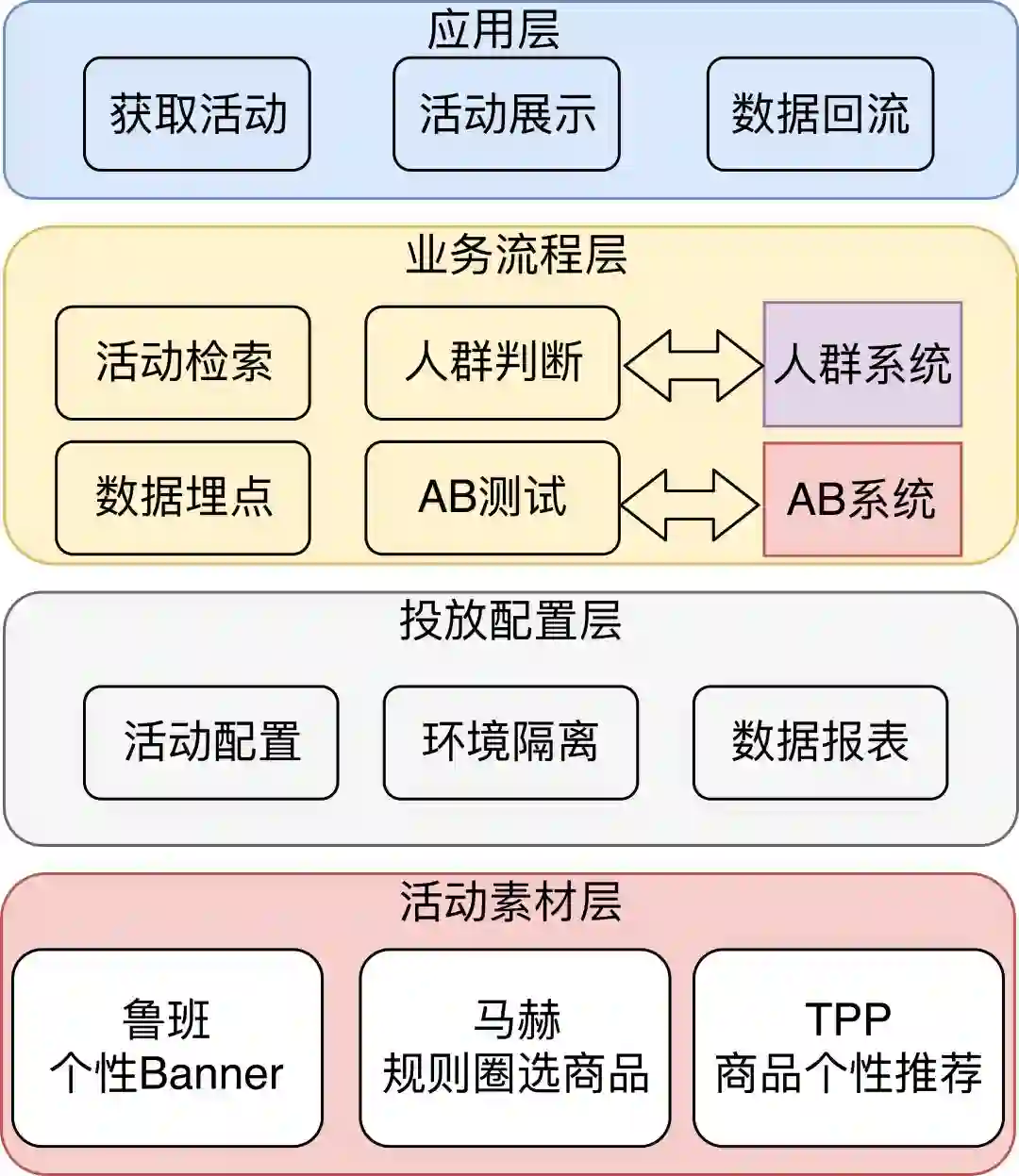 每个资源位会投放多个活动,活动与活动之间需要进行排期,每个投放活动中包含人群和素材两类信息,人群用来确定该活动投放的对象,素材用来确定该活动投放的内容,同时在人群下支持AB的能力。环境隔离是为了能够区分线上和线下业务,保证线上的投放环境在线下充分验证后再进行上线。数据报表是对所有投放活动关键指标的数据汇总。