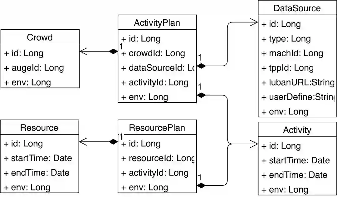首先介绍第一个方案,依照总体功能设计我希望平台中每个模块都可以灵活复用,可以利用已有模块,快速搭建出满足业务要求的投放活动,所以从业务角度进行了抽象,把能拆分的模块尽可能的抽象出来,最终的实体关系如下图所示。从业务逻辑角度共抽象了6个实体分别是资源位(Resource)、活动(Activity)、人群(Crowd)、素材(Data Source)、资源位和活动的关系(Resource Plan)、活动和人群素材的关系(Activity Plan)实体,每个模块之间可以按照下图的关系进行自由组合成一个投放活动。
