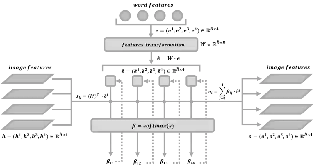 AttnGAN 通过利用注意力机制来实现多阶段细颗粒度的文本到图像的生成,它可以通过关注自然语言中的一些重要单词来对图像的不同子区域进行合成。比如通过文本“一只鸟有黄色的羽毛和黑色的眼睛”来生成图像时,会对关键词“鸟”,“羽毛”,“眼睛”,“黄色”,“黑色”给予不同的生成权重,并根据这些关键词的引导在图像的不同的子区域中进行细节的丰富。AttnGAN 中注意力机制的操作原理如上图所示。