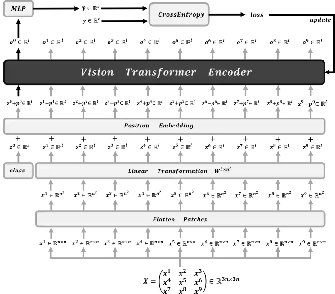 本节主要详细介绍 Vision Transformer 的工作原理,3.1 节是关于 Vision Transformer 的整体框架,3.2 节是关于 Transformer Encoder 的内部操作细节。对于 Transformer Encoder 中 Multi-Head Attention 的原理本文不会赘述,具体想了解的可以参考上一篇文章《矩阵视角下的 Transformer 详解(附代码)》中相关原理的介绍。