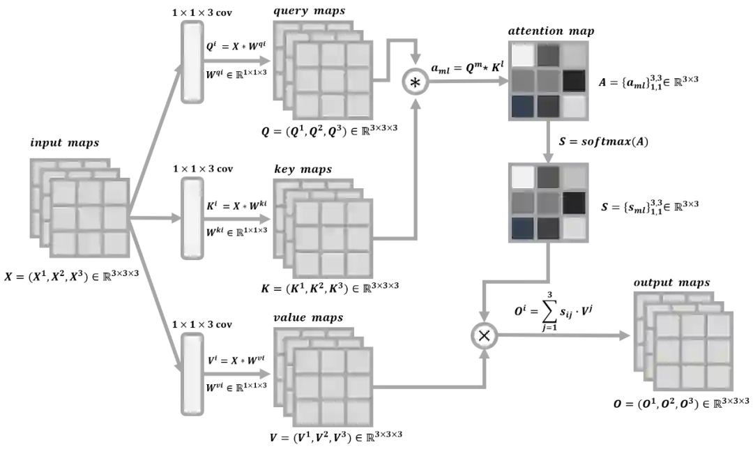 SAGAN 在 GAN 的框架中利用自注意力机制来捕获图像特征的长距离依赖关系,使得合成的图像中考量了所有的图像特征信息。SAGAN 中自注意力机制的操作原理如上图所示。