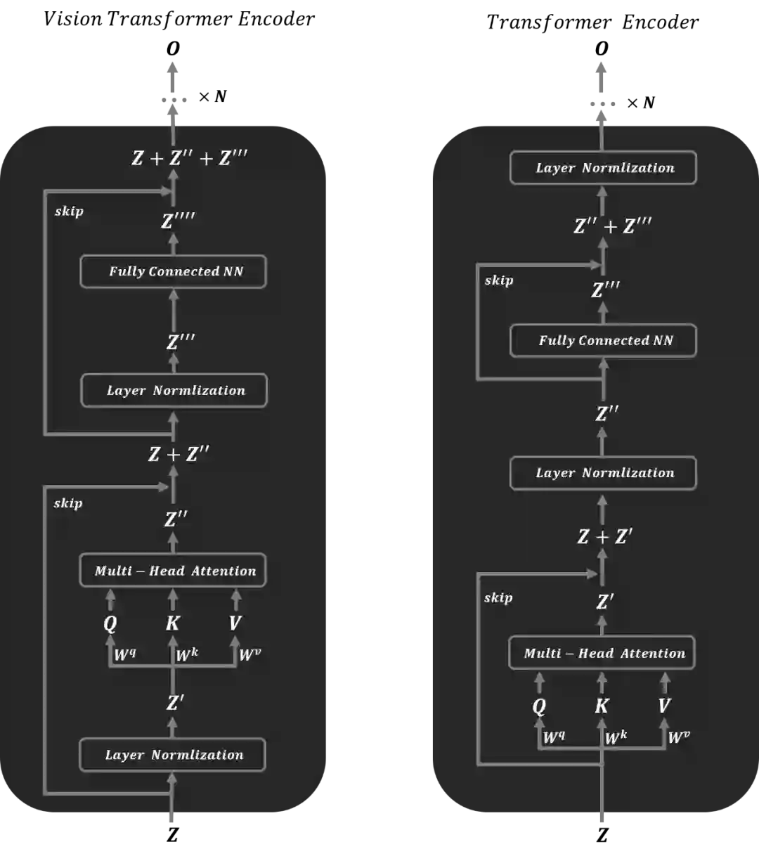 如下图所示分别为 Vision Transformer Encoder 模型结构图和原始 Transformer Encoder 的模型结构图。可以直观的发现 Vision Transformer Encoder 和 Transformer Encoder 都有层归一化,多头注意力机制,残差连接和线性变换这四个操作,只是在操作顺序有所不同。在以下的 Transformer 代码实例中,将以下两种 Encoder 网络结构都进行了实现,可以发现两种网络结构都可以进行很好的训练。