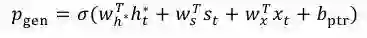 是Ptr-Net在做完softmax归一化后的结果。而 pgen 则是一个比例系数。这个系数这样计算得到:
