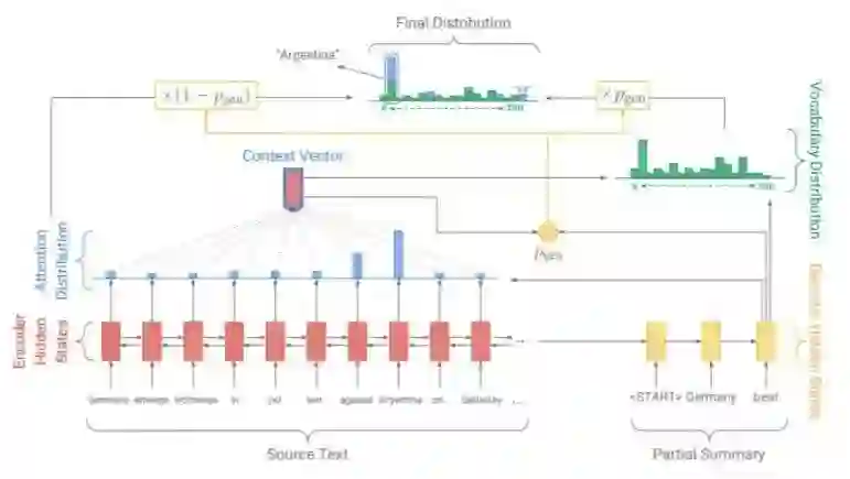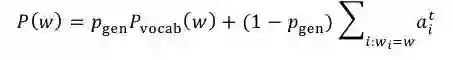 是一个在词语上的概率分布。所以和普通的Ptr-Net不同的是,普通的Ptr-Net指针指向的是encoder输入中的一个位置,把该位置的输入拷贝到decoder来,而这个模型中,最后作为decoder输入的是一个词语概率分布。