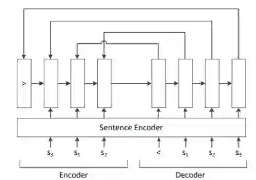 句子排序任务是把一系列的句子调整为连贯、可读性强的文本,是自然语言处理领域中十分重要而又困难的工作。一段好的文档是有很高的逻辑性和主题结构的,因而在许多任务当中都需要用到句子排序。L Logeswaran[5]和J Gong[6]等人,则提出了基于Ptr-Net的句子排序任务。如图7所示,模型的输入是若干句子 s=s1,…,sn,对于训练对(s,o),我们可以得到: