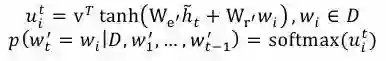 其中向量 ui 在经过 softmax 规范化后得到的概率分布便是基于输入内容的输出预测分布。公式中的v, W1, W2 都是可学习的参数。在这个过程中,我们直接使用得到的softmax结果去拷贝encoder对应的输入元素作为的decoder输入的向量。