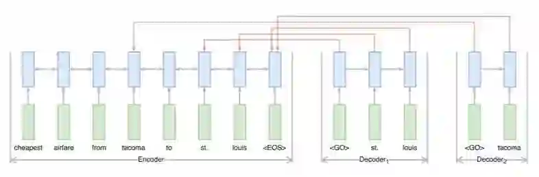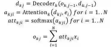 大部分结果显著的信息抽取方法是依赖于token-level标签的,但是得到这些标签是费时费力的,并且这些标签作为一个中间步骤,并不是任务期望的输出结果。因而在2017年,RB Palm[4]等人提出了End-to-End的信息抽取方法,该方法基于Ptr-Net的思想,在没有使用token-level标签的情况下便得到了非常有竞争力的结果。如图6所示,该模型的输入是N个词语x = x1,…,xN,模型中使用了一个共享的encoder,但是decoder则是有多个的,每一个decoder对应一个需要被抽取得到的信息。用k=1,…,K 表示decoder的序号。在每一步j,每一个decoder都需要计算出一个,即softmax归一化前的attention分数。