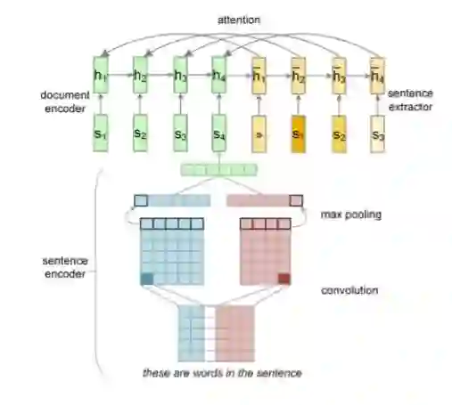 其中ej和di分别表示encoder第j步和decoder第i步的隐层。而v和W是可以学习的参数。而如图7所示中的sentence encoder部分则可以通过CNN, RNN等各种方法来完成。