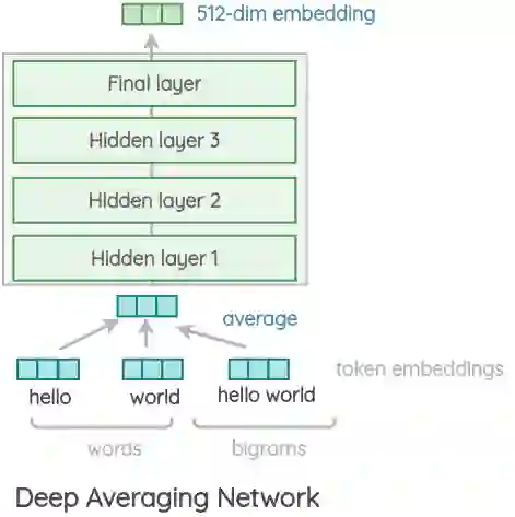 在这个更简单的变体中,编码器基于Iyyer等人提出的架构。首先,将一个句子中单词的嵌入和bi-grams平均在一起。然后通过4层前馈深度DNN,得到512维句子嵌入输出。单词和bi-grams的嵌入是在训练中学习的。