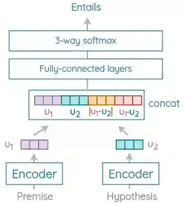 使用共享的Transformer/DAN编码器对句子进行编码,得到输出的512维的嵌入u1和u2。然后,使用L1距离和点积(角度)把它们拼接起来。将此拼接向量通过全连接层,应用softmax得到隐含类/矛盾类/中性类的概率。
