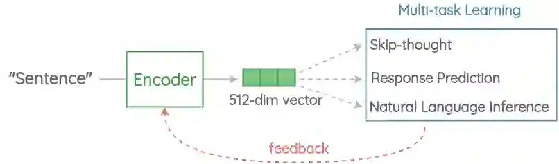 在较高的层次上,这个想法是设计一个编码器,将任何给定的句子总结为一个512维的句子嵌入。我们用同样的嵌入来解决多个任务,并根据它在这些任务上所犯的错误,更新句子嵌入。由于相同的嵌入必须在多个通用任务上工作,因此它将只捕捉最有信息的特征,并丢弃噪声。直觉上,这将得到一个通用的嵌入,可以普遍迁移到广泛的NLP任务,如相关性,聚类,释义检测和文本分类。