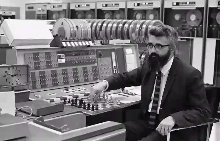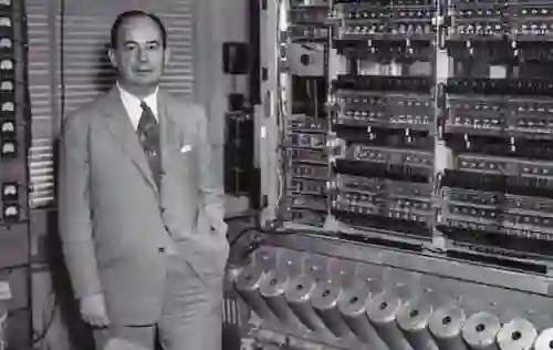 被誉为「计算机之父」的普林斯顿大学教授约翰·冯·诺依曼身着正装站在计算机前