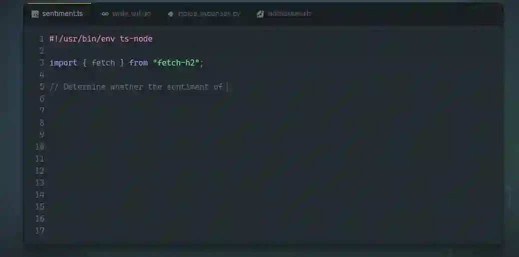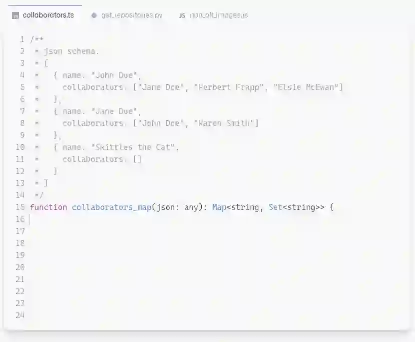 先来看一下 Copilot 的主要功能——代码补全的效果。以 TypeScript 语言为例,给出函数名和参数,Copilot 就能自动补全代码。