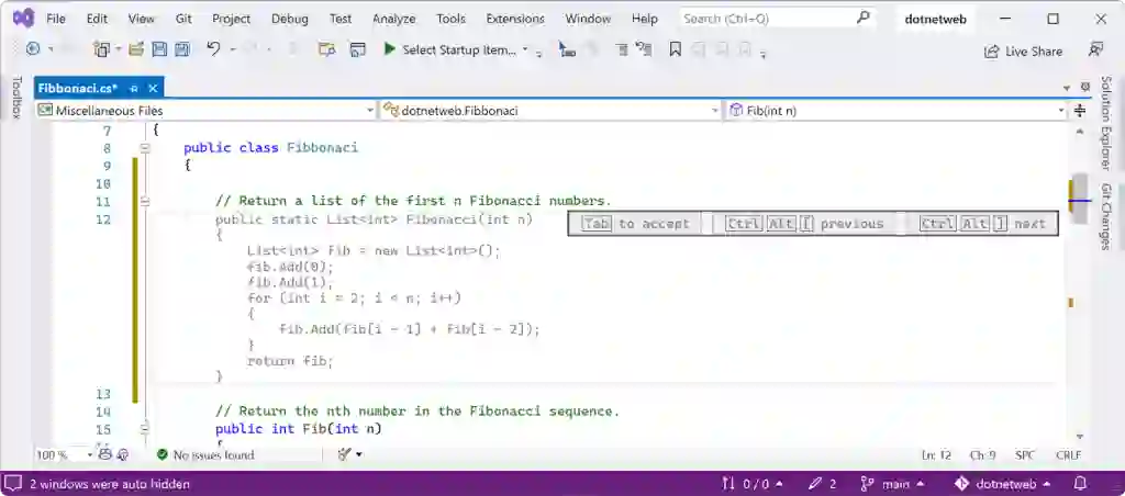 在 Visual Studio 2022 中当你键入时,GitHub Copilot 会自动建议你可能需要的代码。你可以按 Tab 键接受,也可以继续输入忽略建议代码,GitHub Copilot 将根据它认为你在做什么提出更多建议。如果你不需要建议,也可以按 Esc 键完全清除建议。
